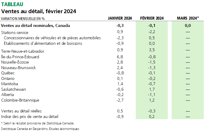 - Les ventes au détail au Canada ont fléchi de 0,1 % en février par rapport au mois précédent, une deuxième baisse mensuelle consécutive après le recul de 0,3 % en janvier. Ce chiffre est inférieur au résultat provisoire de Statistique Canada et au consensus des prévisionnistes économiques, qui tablaient sur une hausse de 0,1 %. Le tableau ci-dessous résume les principales données.