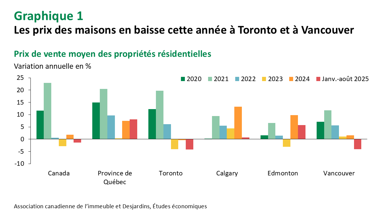 Comme le souligne notre plus récente publication sur les perspectives immobilières Lien externe au site., les données nationales masquent des disparités régionales marquées. Derrière une apparente stabilité à l’échelle canadienne, les provinces – et même les villes au sein de celles-ci – évoluent dans des directions opposées, influencées par des conditions économiques divergentes et des déséquilibres entre l’offre et la demande de logements. À l’échelle nationale, l’offre excédentaire a contribué à la stagnation du prix moyen de vente désaisonnalisé et du prix de référence en août. Ces deux indicateurs demeurent environ 14 % et 18 % sous leurs sommets du début de 2022, respectivement. Cela dit, le prix moyen de vente a atteint de nouveaux sommets en août 2025 dans plusieurs provinces, dont la Nouvelle‑Écosse, le Québec, le Manitoba, la Saskatchewan et l’Alberta. Les baisses marquées des prix à Toronto et à Vancouver ont toutefois eu un effet modérateur important sur la moyenne nationale (graphique 1).