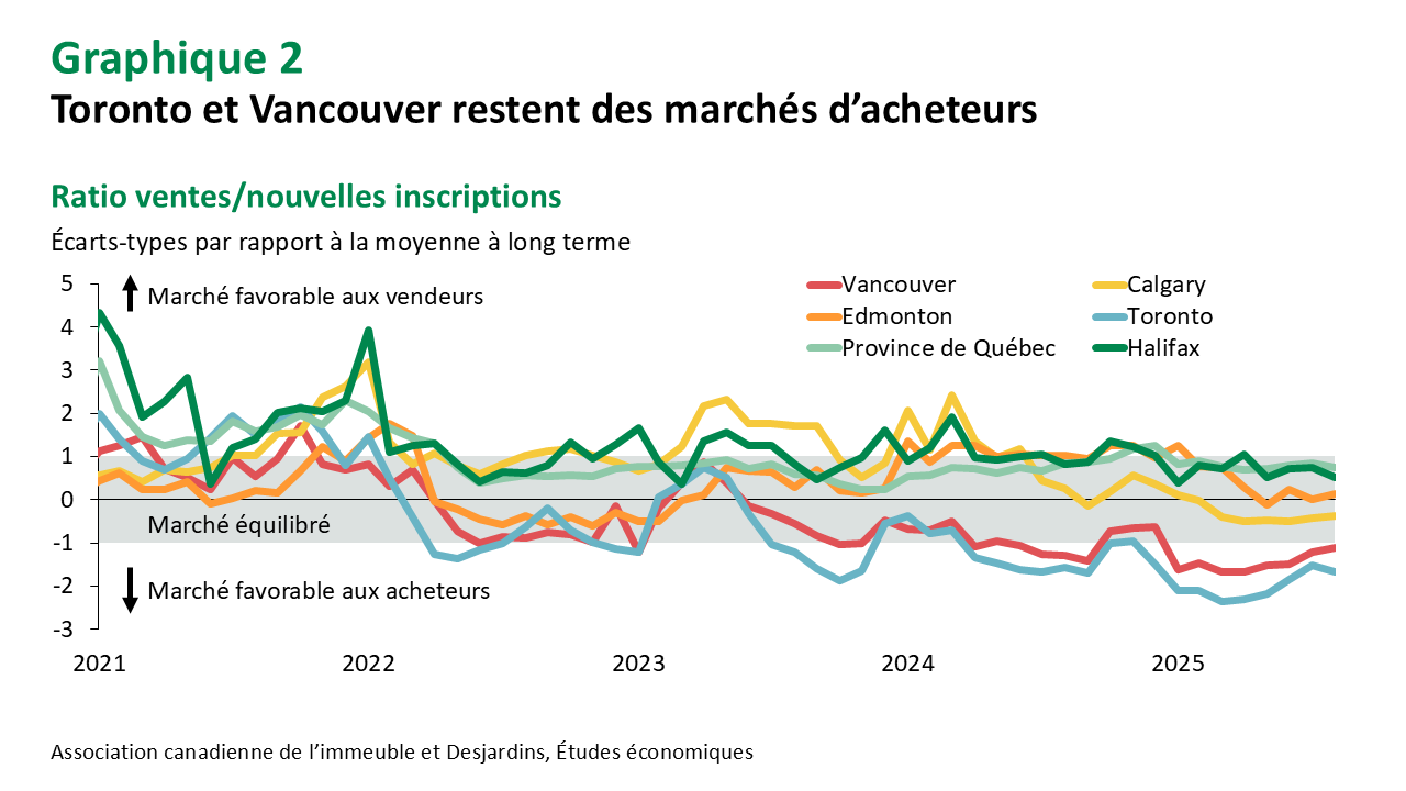 À l’échelle du pays, les nouvelles inscriptions ont augmenté de 2,6 % en août, tandis que le niveau des stocks est demeuré stable à 4,4 mois – bien au-dessus de la moyenne observée depuis 2019, qui se situe autour de 3,7 mois. Le ratio ventes/nouvelles inscriptions a légèrement reculé après quatre mois de progression, mais demeure en territoire équilibré à l’échelle nationale. À Toronto, le recul des ventes désaisonnalisées en août a interrompu la tendance vers un marché plus équilibré (graphique 2). À Québec, la croissance mensuelle des ventes résidentielles a ralenti à 0,6 % et le prix moyen de vente a fléchi de 0,3 % durant le mois, après des hausses soutenues plus tôt cette année. Il reste à voir si le marché immobilier de la capitale a atteint un sommet ou s’il marque simplement une pause.