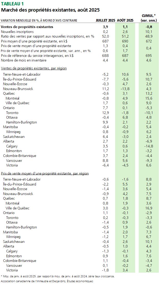 - Les ventes résidentielles au Canada ont augmenté de 1,1 % en août, sur une base mensuelle désaisonnalisée.