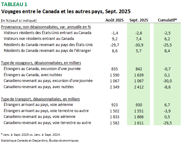 - Le nombre de résidents canadiens revenant de voyages aux États‑Unis a chuté de 30,9 % en glissement annuel en septembre 2025, tandis que le nombre de voyages au Canada effectués par des résidents américains a reculé de 2,6 %.
