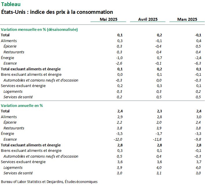 Il reste maintenant à voir si la politique commerciale aura davantage d’effet sur l’IPC des prochains mois. La valse-hésitation dans l’imposition des tarifs, notamment entre les États‑Unis et la Chine, fait que les entreprises ne savent pas trop sur quel pied danser et si elles doivent bientôt ajuster leur prix ou attendre que la tempête passe. Comme nous disions déjà au début de la guerre commerciale, l’imposition des tarifs prendra du temps à se manifester, mais on risque tout de même de commencer à en avoir les premiers effets tangibles au cours de l’été.