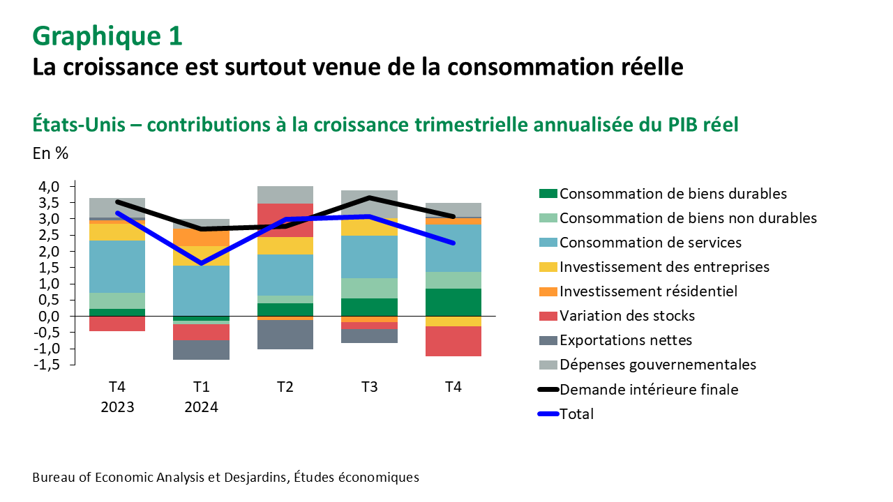 D’ailleurs, au sein de la demande intérieure, on note surtout la forte contribution de la consommation réelle. La croissance annualisée de 4,2 % de cette composante, qui représente plus de 70 % du PIB, est la meilleure depuis l’hiver 2023. Dans un contexte de taux d’intérêt qui sont demeurés élevés et de confiance chancelante à l’approche des élections, cette performance des ménages est remarquable. La résilience du marché du travail et des revenus (le revenu disponible réel a augmenté de 2,8 % à rythme annualisé au quatrième trimestre) a évidemment aidé.