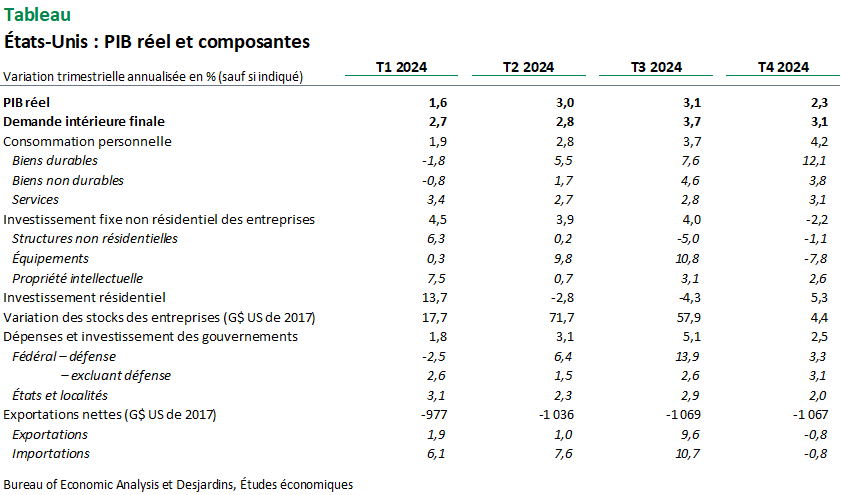 - Le PIB réel a augmenté de 2,3 % à rythme annualisé au quatrième trimestre de 2024, selon l’estimation initiale des comptes nationaux. Cette croissance est plus lente que les gains annualisés de 3,1 % au troisième trimestre et de 3,0 % au deuxième.