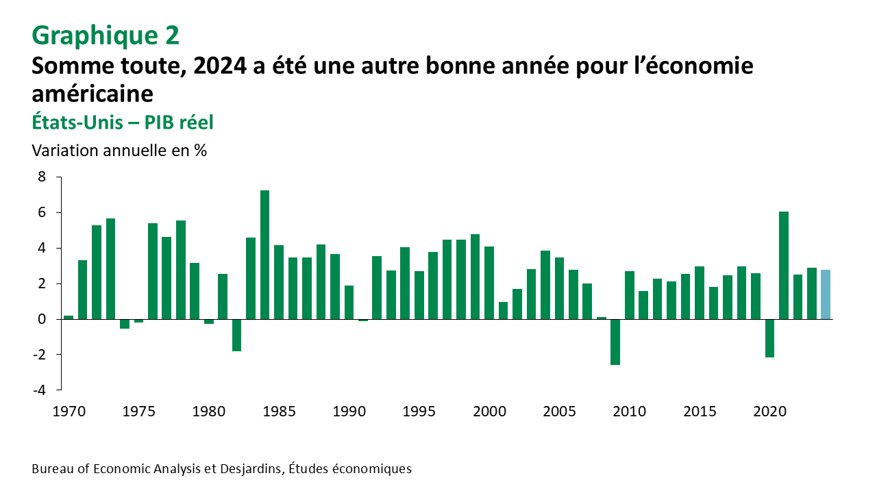 Sur l’ensemble de l’année, la croissance du PIB réel américain est demeurée bonne. Elle se compare d’ailleurs très avantageusement avec les performances plutôt faibles des autres principaux pays avancés. Le PIB réel de la zone euro n’a crû que de 0,7 % en 2024. La suite des choses dépend évidemment des politiques qui seront mises en place par le président Donald Trump, à commencer par la possibilité de tarifs plus élevés.