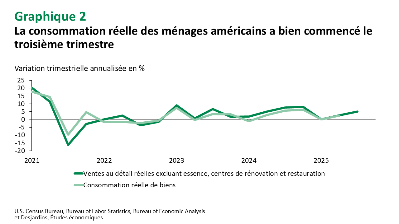 Qu’est-ce qui explique la bonne performance des ventes alors que les indices de confiance des consommateurs sont plutôt faibles et que le marché du travail semble stagner? D’une part, il y a évidemment un effet prix qui gonfle la croissance de la valeur des ventes. La moitié de la croissance des ventes serait attribuable à une hausse des prix en août. Deuxièmement, il y a peut-être aussi l’effet des anticipations inflationnistes plutôt élevées de la part des consommateurs. Ceux-ci, craignant que les prix grimpent encore plus, devancent probablement certains achats avant qu’ils ne soient trop dispendieux. Finalement, même si la confiance est plutôt basse, elle est tout de même plus élevée qu’au printemps et l’incertitude s’est aussi un peu modérée au cours de l’été. En ajoutant les effets présumés de la détente fiscale amenée par le « One Big Beautiful Bill », cela pousse probablement certains ménages à garder un bon rythme de dépenses.