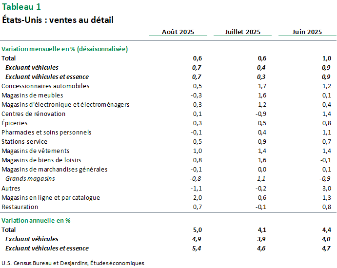 - Les ventes au détail ont augmenté de 0,6 % en août, après une hausse similaire en juillet. Excluant les autos et l’essence, les ventes affichent une croissance de 0,7 %.