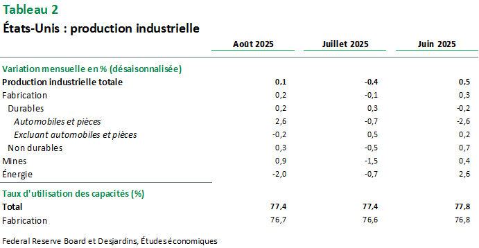 Même si la croissance paraît plutôt modeste, la production industrielle a aussi fait mieux que les attentes en août. Le gain de 0,2 % de la fabrication est particulièrement étonnant alors que le nombre d’employés ainsi que les heures travaillées étaient en baisse le mois dernier au sein de ce secteur. Cela est d’autant plus vrai pour le secteur automobile, dont la production a bondi de 2,6 % en août. On observe aussi une très grande volatilité de la production industrielle depuis quelque temps alors qu’elle n’a pas enregistré deux hausses mensuelles consécutives depuis le printemps de 2024, une situation récemment exacerbée par les aléas de la politique commerciale américaine.
