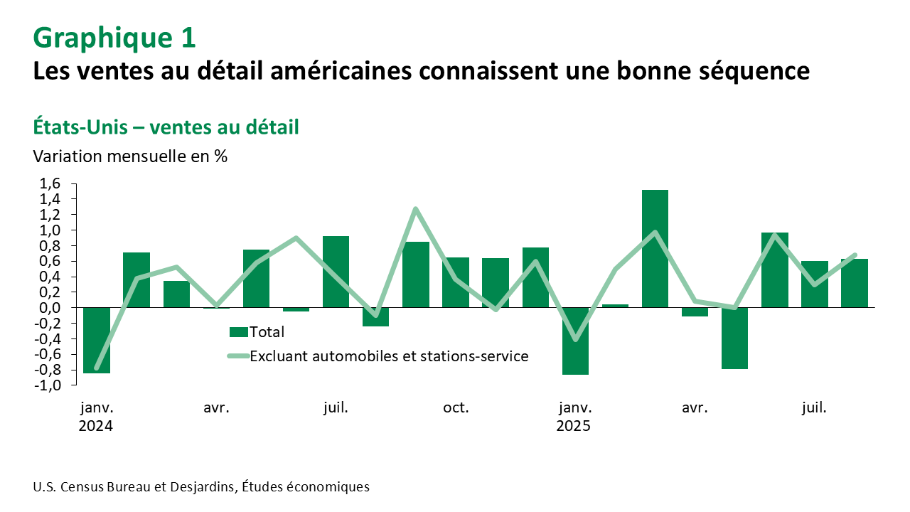 La bonne croissance des ventes au détail se poursuit aux États-Unis. Le résultat d’août s’est montré nettement au-dessus des attentes du consensus, où un gain de seulement 0,2 % était anticipé pour les ventes totales. De plus, la hausse d’août fait suite à deux bonnes croissances mensuelles. La moyenne des trois derniers mois est d’ailleurs la plus forte depuis juin 2022.