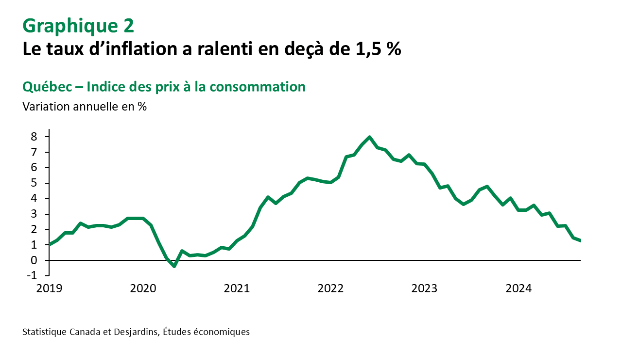 Par ailleurs, le taux d’inflation au Québec, qui a ralenti de façon convaincante jusqu’à 1,3 % en septembre, apaise les craintes des ménages concernant les hausses à venir des prix à la consommation (graphique 2).