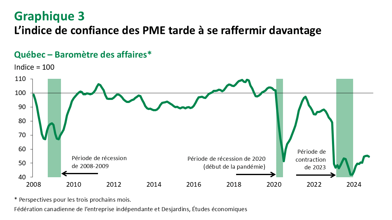 Du côté des entreprises, la remontée de la confiance des PME s’essouffle (graphique 3) malgré la baisse des taux d’intérêt et à la maîtrise de l’inflation. Les investissements en machines et équipements ont commencé à se raffermir, mais les exportations sont plus hésitantes depuis quelques mois. Le résultat des élections américaines sera déterminant à cet égard, selon une récente analyse Lien externe au site..