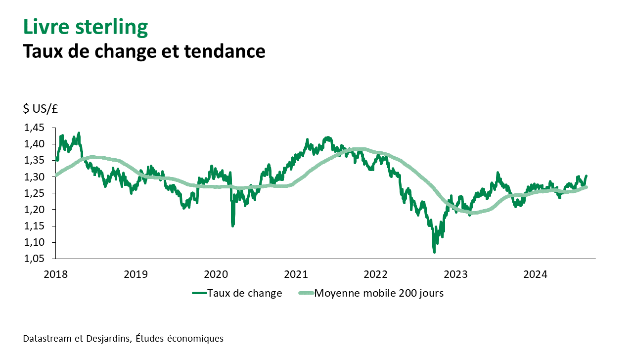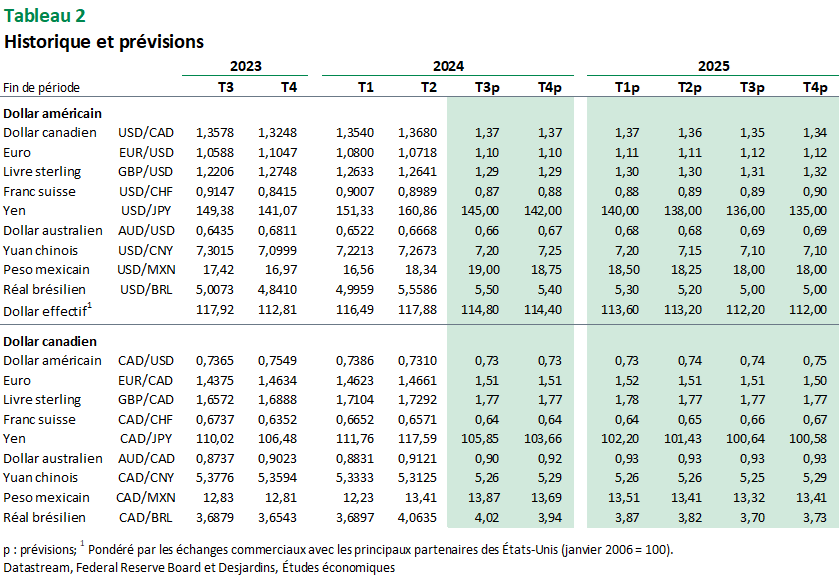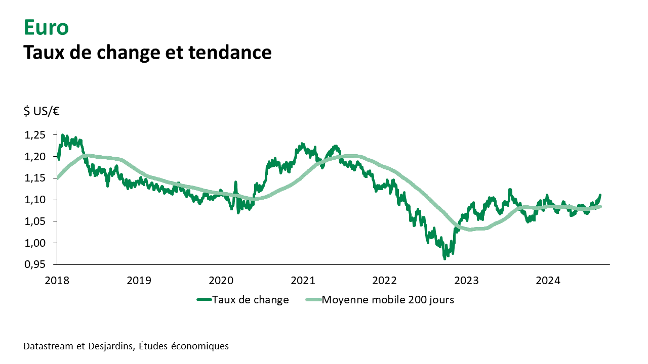 - Le taux de change canadien se situe actuellement à près de 1,36 $ CA/$ US, après avoir avoisiné 1,39 $ CA/$ US au début du mois d’août, ce qui constitue une appréciation notable. Nous croyons cependant que le dollar canadien se dépréciera légèrement au cours des prochains mois. L’appétit pour le risque des investisseurs pourrait encore vaciller à court terme. L’économie canadienne apparaît plus fragile et il serait étonnant de voir la Banque du Canada diminuer ses taux directeurs moins vite que la Fed d’ici la fin de 2024. Les cours des matières premières risquent aussi de demeurer volatils en fonction de la perception de l’état de l’économie mondiale.