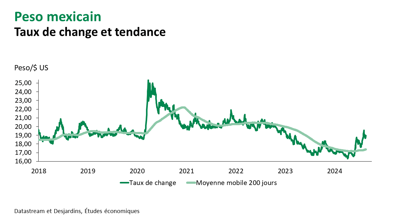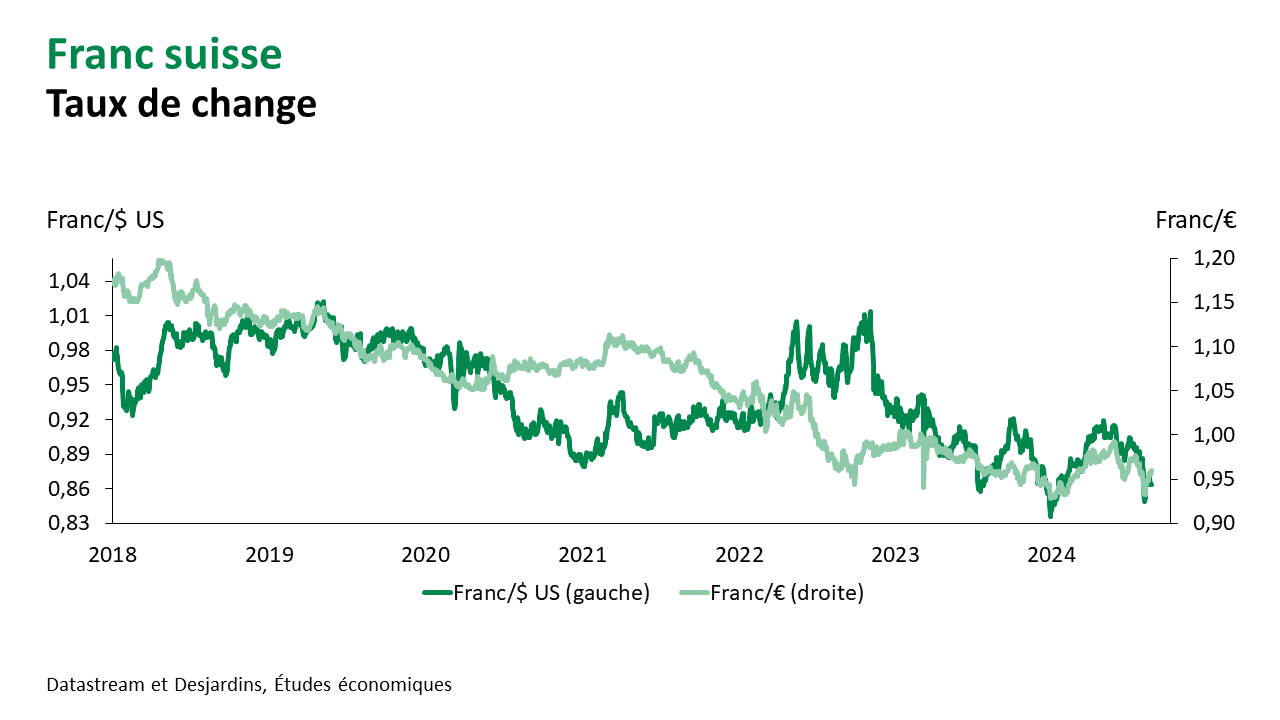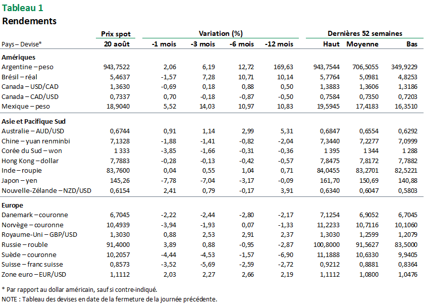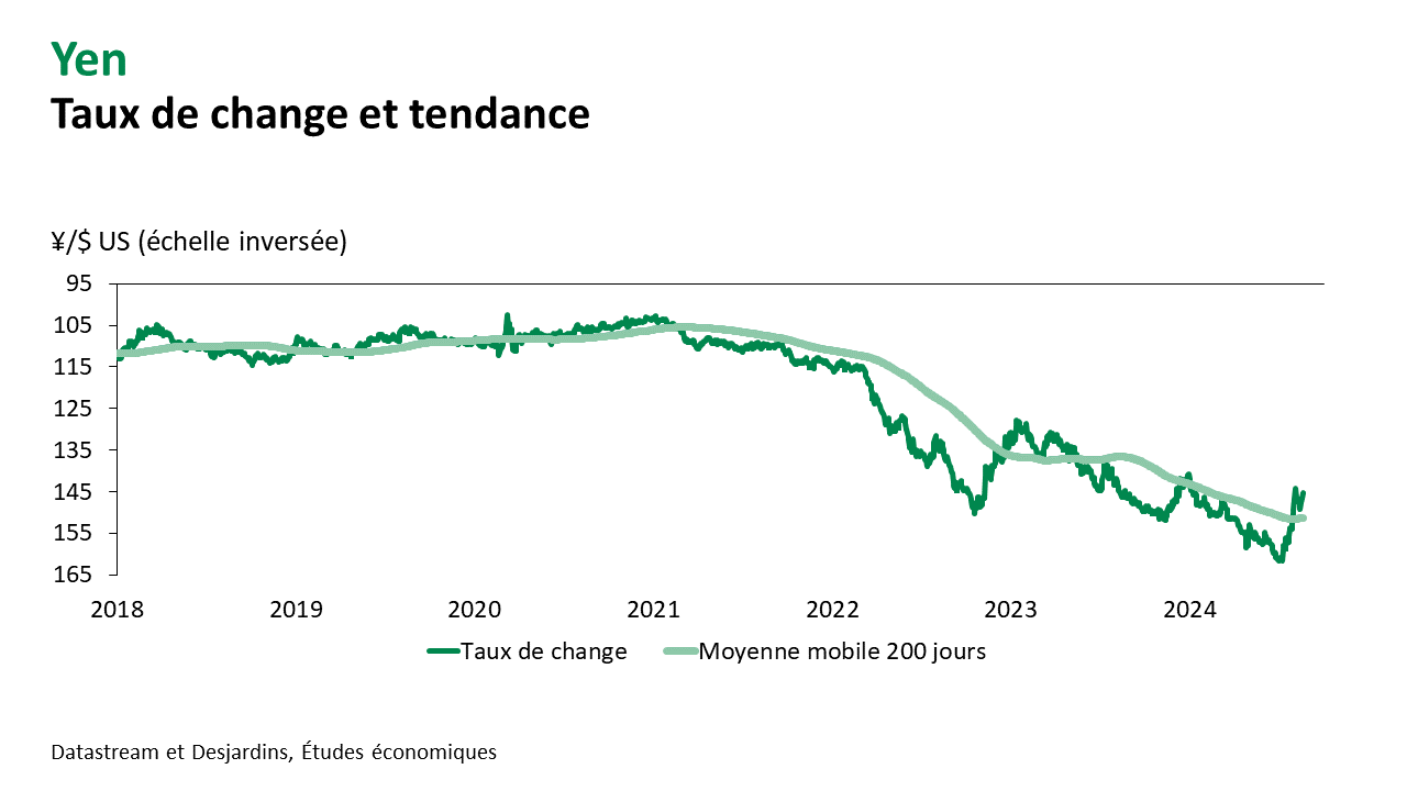 - L’effet net sur le dollar américain a été une dépréciation, mais il importe d’être plus nuancé. D’abord, le billet vert a souffert du relèvement des attentes de baisses de taux d’intérêt à venir aux États-Unis. La divergence des taux d’intérêt que l’on observait avec plusieurs autres devises s’est amenuisée. Le yen japonais et l’euro figurent parmi les devises qui en ont le plus profité. Par contre, d’autres devises ont eu plus de mal, notamment celles de plusieurs pays émergents et celles liées au cours des matières premières. Au-delà de l’évolution des taux d’intérêt, les marchés ont incorporé les effets d’une économie américaine possiblement plus faible et ce n’est généralement pas une bonne nouvelle pour plusieurs pays et leur devise. L’appétit pour le risque chez les investisseurs a aussi chuté au début du mois d’août, ce qui s’accompagne souvent d’une demande accrue pour des actifs libellés en dollar américain ou en d’autres devises jugées sécuritaires.
