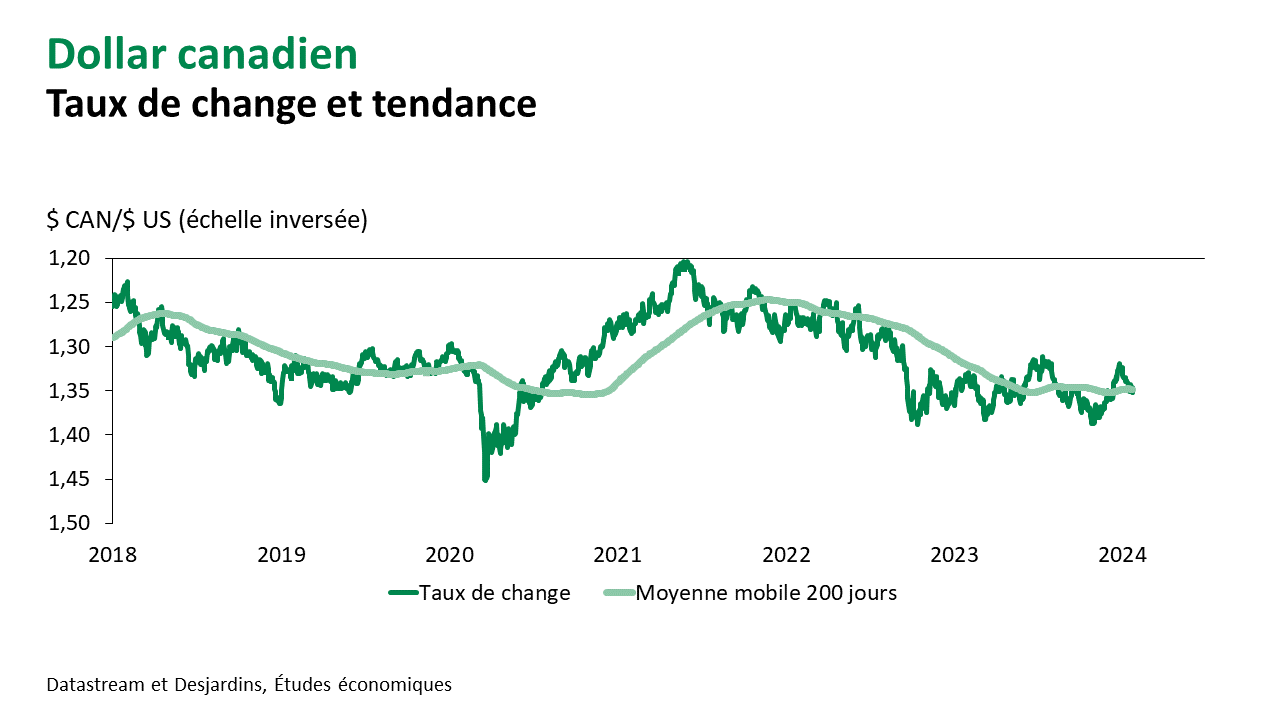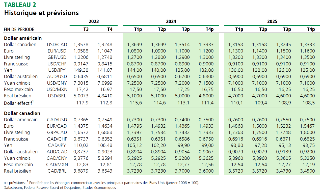 - À plus long terme, de meilleures perspectives économiques et un plus grand appétit pour le risque laissent présager un retour de l’appréciation de plusieurs devises contre le dollar américain. Le potentiel d’appréciation pourrait être un peu plus faible pour le dollar canadien alors qu’on ne prévoit pas de fortes hausses des prix des matières premières en 2025. Les investisseurs pourraient aussi continuer d’escompter des risques du côté du marché de l’habitation au Canada, notamment avec la poursuite des renouvellements hypothécaires à des taux d’intérêt plus élevés que les précédents.