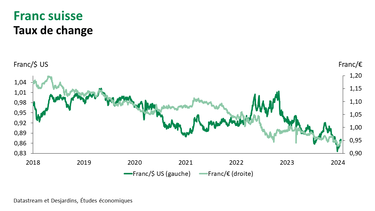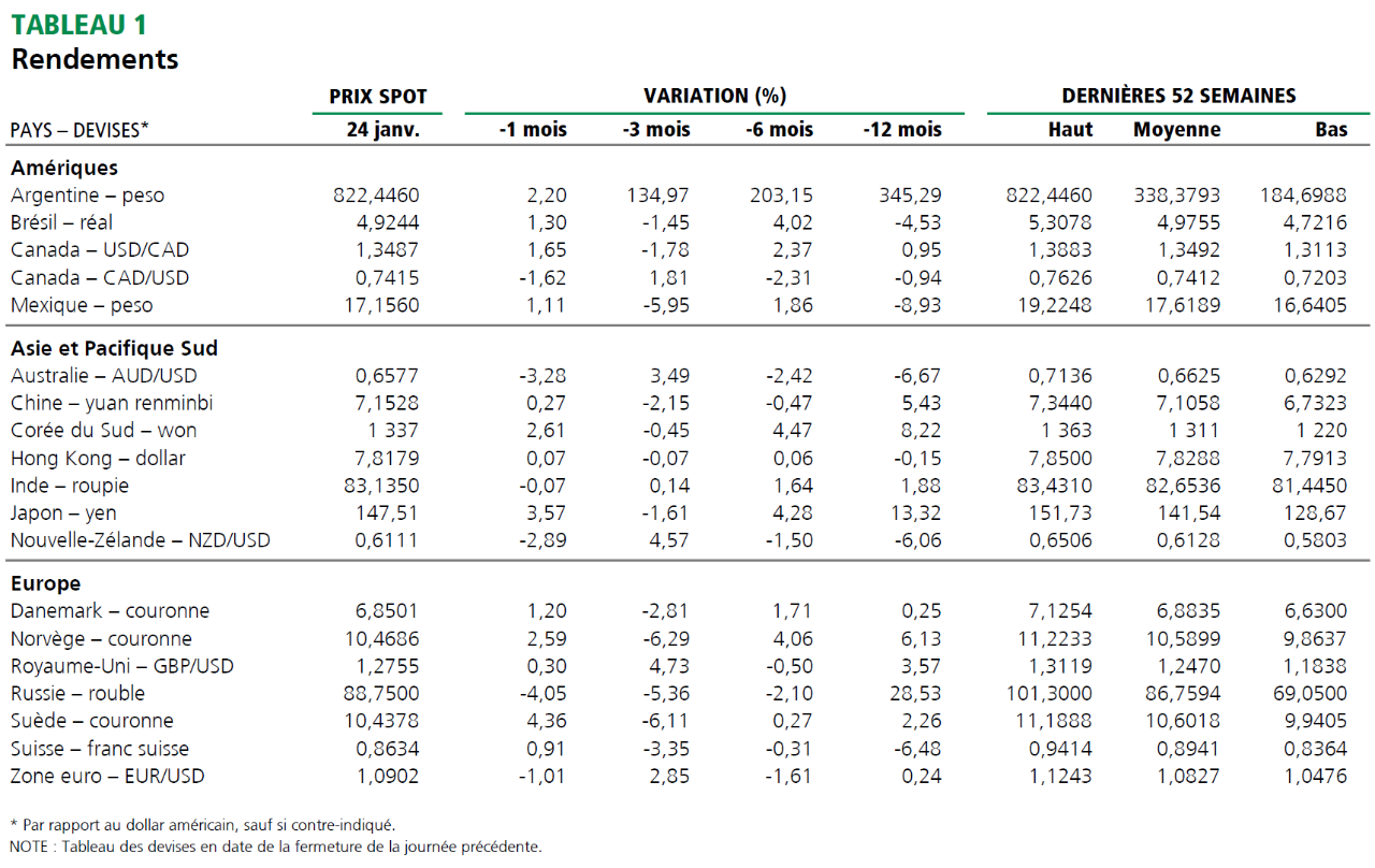 - Le Canada figure parmi les pays où les chiffres sur l’inflation ont déçu. Plusieurs mesures visant à capter la tendance de base de l’inflation se sont accélérées. Néanmoins, la Banque du Canada s’est tout de même montrée plus neutre lors de sa rencontre du 24 janvier en prenant aussi en considération que l’économie canadienne a ralenti. Elle a notamment retiré sa mention quant à de possibles autres hausses de taux d’intérêt. Cela a contribué à faire déprécier un peu plus le huard. Celui-ci avait gagné environ 3 % contre le dollar américain dans les dernières semaines de décembre, puis a perdu près de 2 % depuis le début de l’année.