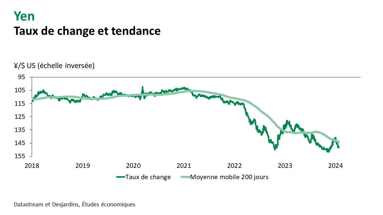 - Ce n’est pas la pire performance parmi les principales devises. Le yen japonais connaît un début d’année difficile, avec une dépréciation de près de 5 %. Cette devise demeure grandement pénalisée par le fait que la Banque du Japon (BoJ) n’a toujours pas amorcé son resserrement monétaire, car cette dernière craint encore que l’inflation redescende sous sa cible au cours des prochaines années. La BoJ signale que les prochaines données sur les négociations salariales, qui seront connues en avril, pourraient la rassurer quant à l’atteinte de sa cible d’inflation à moyen terme, ce qui ouvrirait la voie à un début de normalisation de la politique monétaire nippone.