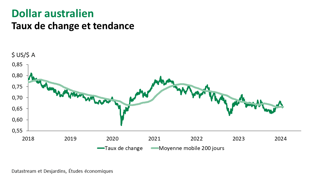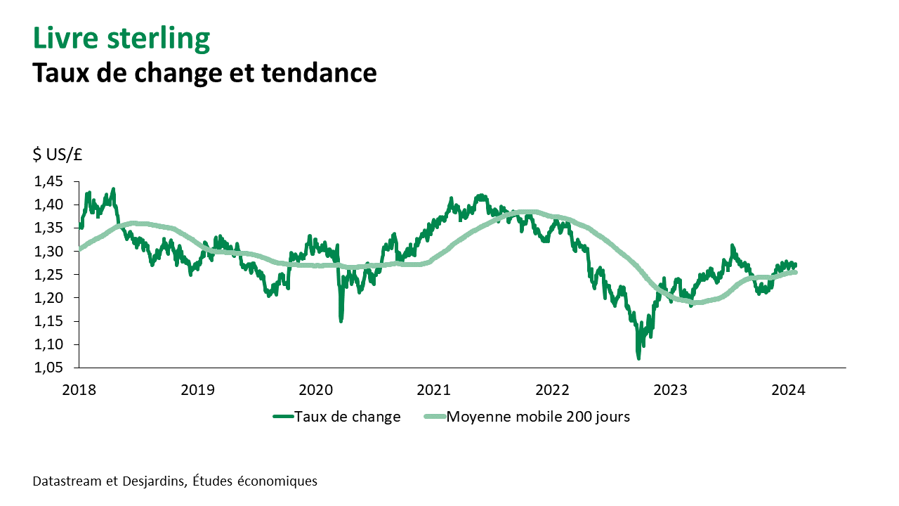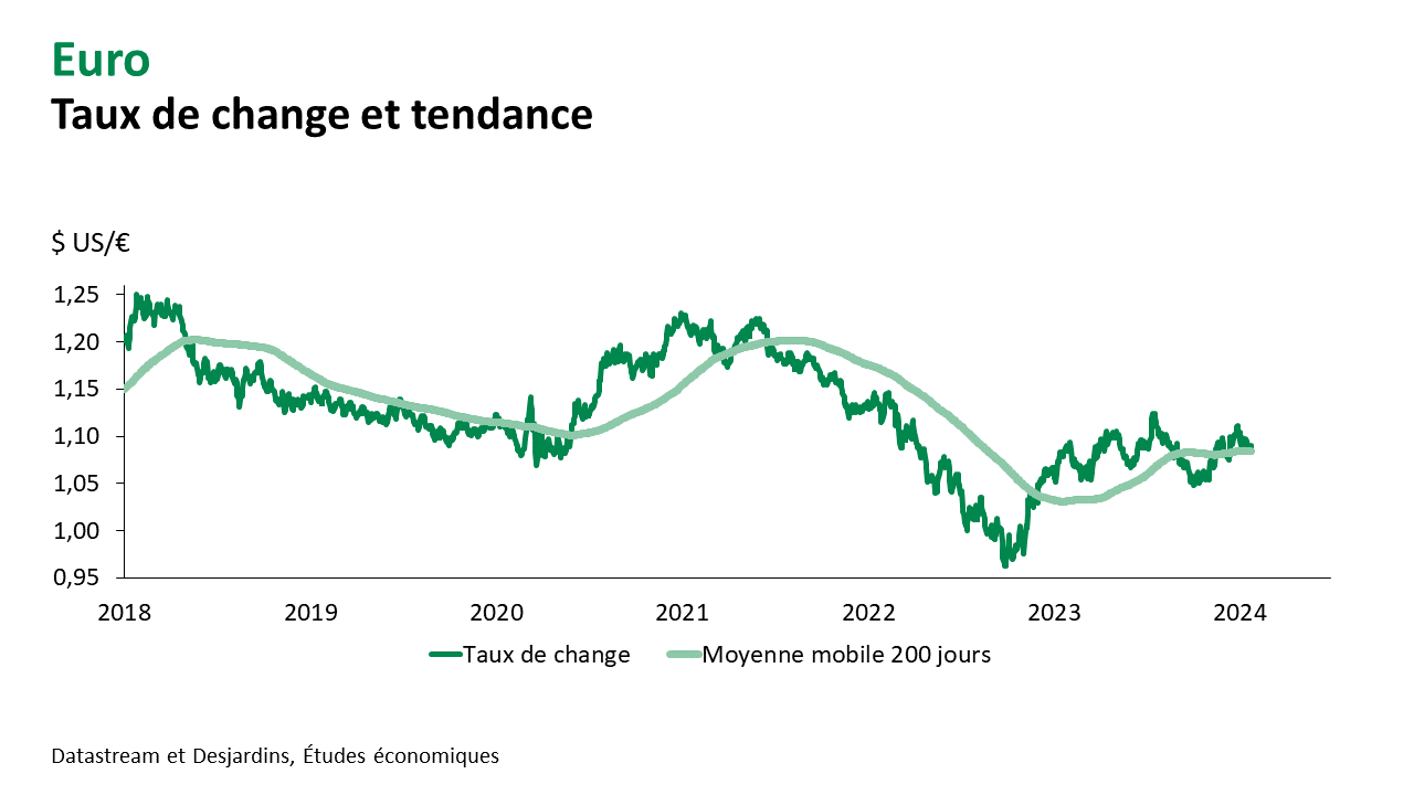 - Du côté des devises européennes, on note surtout la plus grande résilience de la livre, qui se maintient à plus de 1,27 $ US. Les plus récents chiffres sur l’emploi et l’’inflation ont été plus forts que prévu, ne militant pas pour un scénario de diminution rapide des taux d’intérêt directeurs. L’euro s’est un peu déprécié après avoir atteint 1,10 $ US. L’économie continue de paraître plus fragile en zone euro. La Banque centrale européenne a toutefois maintenu un ton prudent à l’égard de l’inflation lors de sa rencontre de janvier.