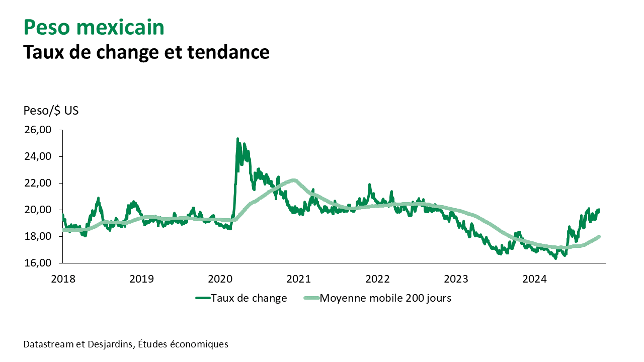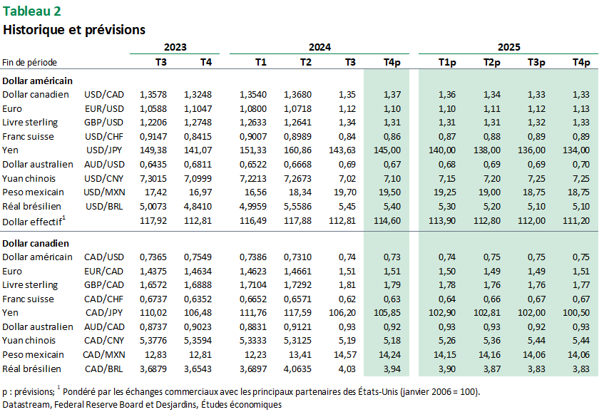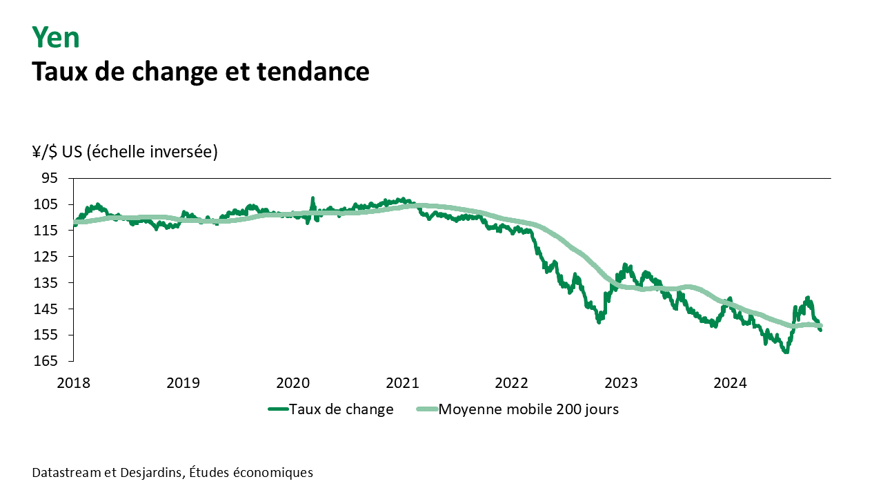 - Un autre élément à surveiller sera l’état de santé de l’économie américaine. Nos prévisions ne misent pas sur le maintien d’un rythme de croissance avoisinant 3 %. Nous misons plutôt sur le retour d’une croissance économique vers 2 % Lien externe au site. aux États-Unis, ce qui permettrait de ramener durablement l’inflation à sa cible, tout en maintenant le marché du travail près de son point d’équilibre. Dans ce scénario, la Fed poursuivrait son cycle de baisses de taux d’intérêt. Le haut de la fourchette du taux des fonds fédéraux pourrait être abaissé à 3,00 % d’ici la fin de 2025. Les importants écarts de taux d’intérêt qui se sont créés récemment avec plusieurs pays s’estomperaient et le dollar américain reprendrait une tendance baissière. Le yen pourrait bénéficier davantage d’un tel revirement, d’autant plus que la Banque du Japon devrait décréter encore d’autres hausses de taux d’intérêt pour normaliser sa politique monétaire.