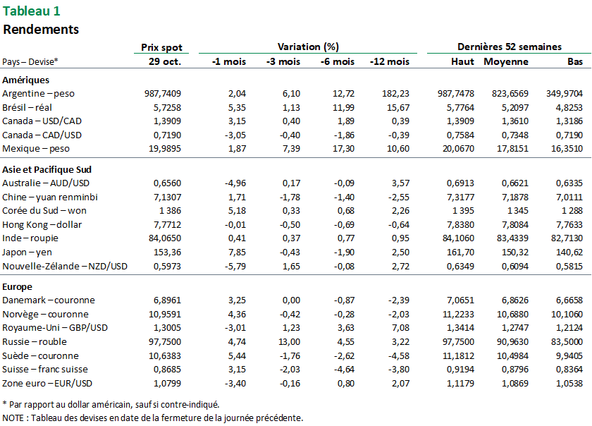 - Le dollar américain a connu un excellent mois d’octobre. Par rapport à plusieurs devises, il se retrouve maintenant près des niveaux où il se situait à la fin du mois de juillet. Cette réappréciation a entre autres été soutenue par l’amélioration de plusieurs données économiques aux États-Unis, ce qui a aussi tempéré les attentes à l’égard du rythme et de l’ampleur des prochaines baisses de taux d’intérêt par la Réserve fédérale (Fed). C’est totalement l’opposé de ce qui s’était produit en août, alors que le billet vert cédait du terrain en raison des données moins encourageantes sur l’économie américaine et des anticipations de baisses plus rapides des taux d’intérêt.