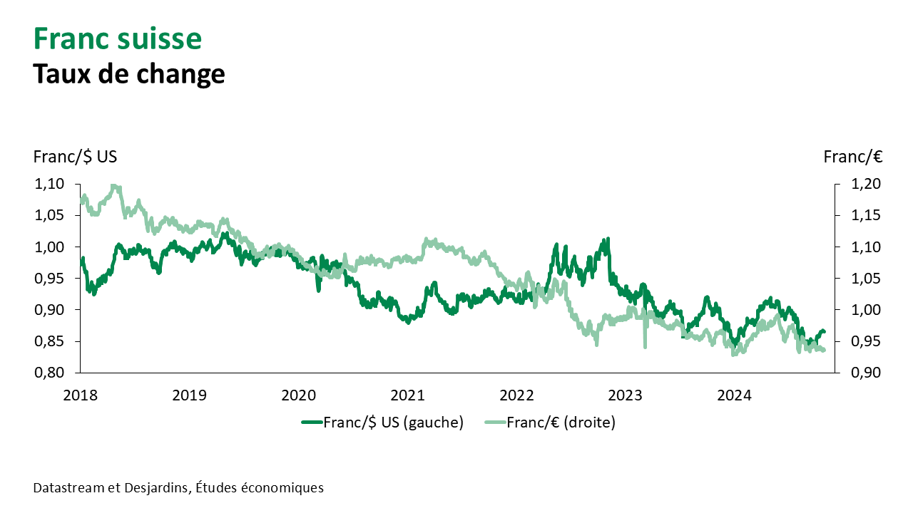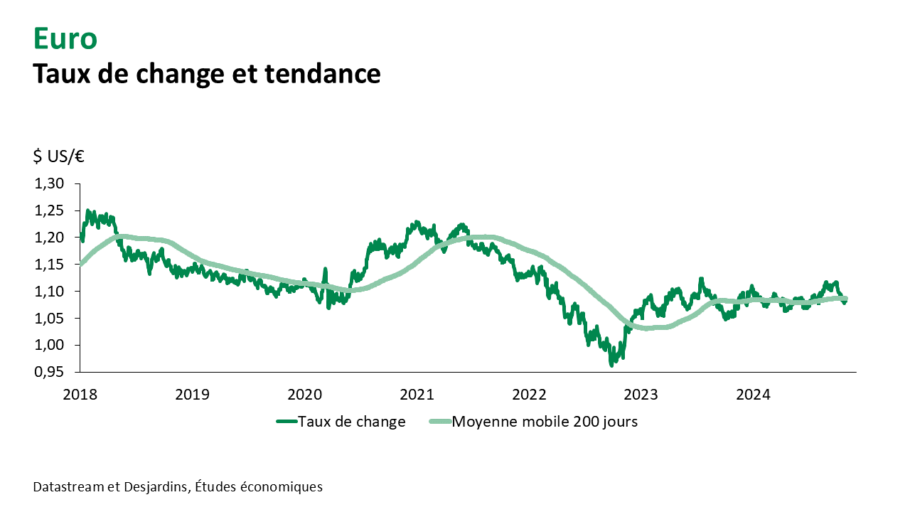 - Cette volte-face à l’égard de l’opinion sur l’état de l’économie et de la tendance à venir des taux d’intérêt s’est aussi observée dans d’autres régions du monde, mais en sens inverse, notamment en Europe. Durant l’été, les données économiques étaient généralement encourageantes sur le Vieux Continent. Les progrès sur l’inflation étaient aussi plus timides qu’aux États-Unis, de sorte que les attentes en matière de baisses de taux d’intérêt étaient plus modérées. La livre et l’euro en avaient grandement bénéficié. Ce n’est maintenant plus le cas avec de nouveaux signaux de ralentissement de l’économie et des taux d’inflation qui ont diminué plus rapidement dans les derniers mois. On anticipe plus facilement plusieurs baisses de taux d’intérêt directeur d’ici la fin de l’an prochain en zone euro et au Royaume-Uni.