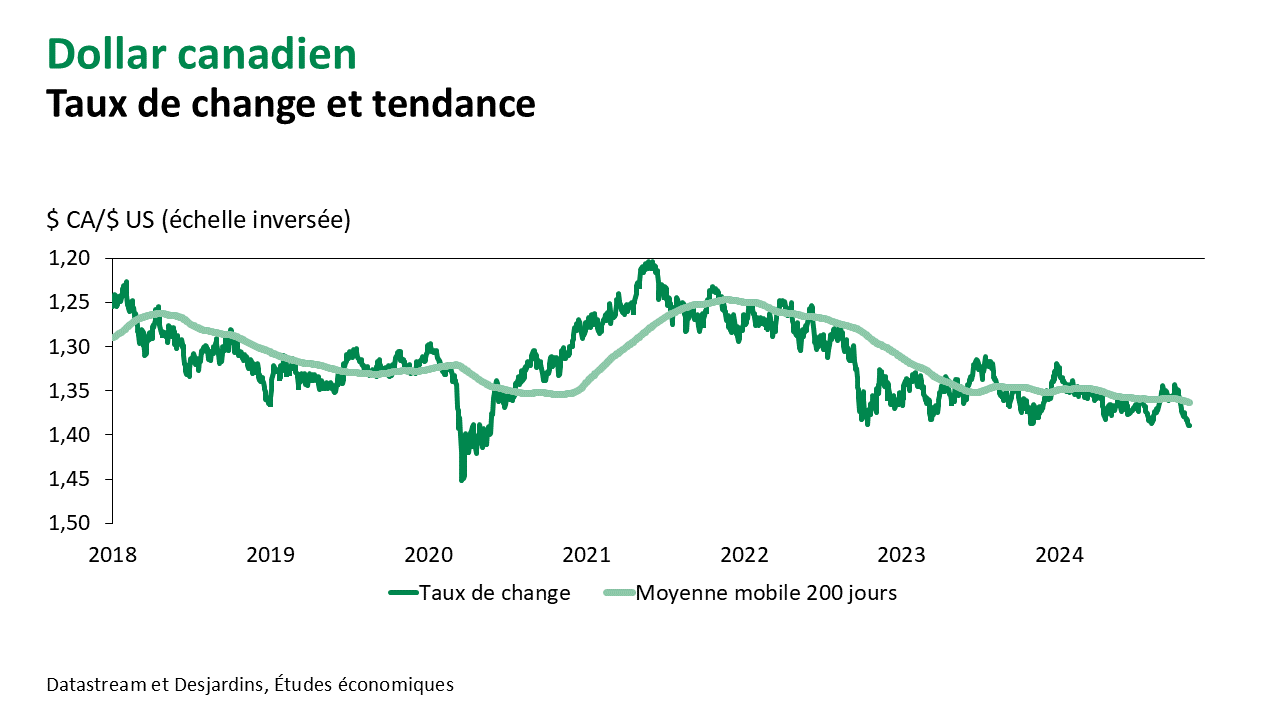 - Plusieurs baisses de taux d’intérêt sont aussi anticipées au Canada, ce qui contribue à élargir les écarts de taux d’intérêt avec les États-Unis et à affaiblir le dollar canadien. La Banque du Canada a d’ailleurs opté pour une réduction de 50 points de base à sa réunion d’octobre, après trois baisses consécutives de 25 points. Cette décision a fait suite à une diminution plus rapide de l’inflation, procurant une marge de manœuvre supplémentaire pour réduire les taux d’intérêt. Le dollar canadien subit en plus les contrecoups d’un affaiblissement de certains cours des matières premières, dont ceux du pétrole.