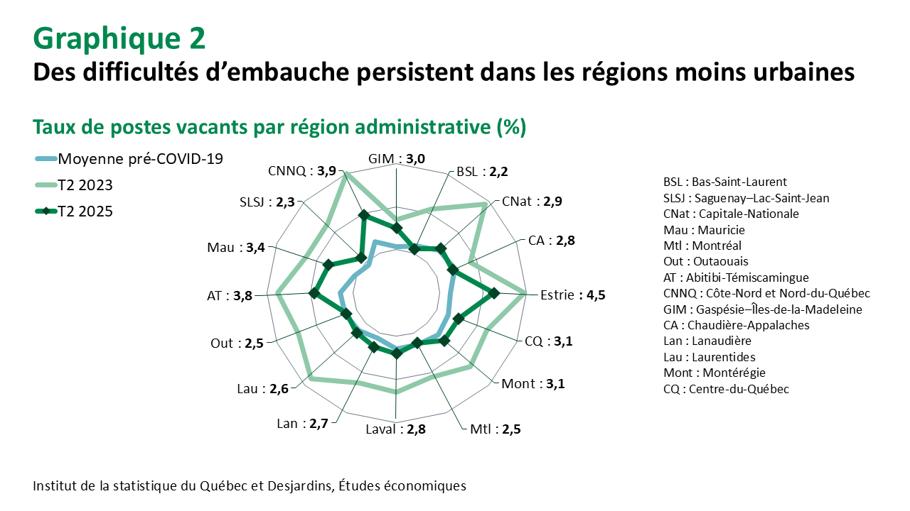 Bien que le marché du travail soit moins tendu qu’en 2022 et en 2023, la disponibilité de la main‑d’œuvre demeure inégale à travers la province. Dans les régions où le taux de chômage est particulièrement faible, les taux de postes vacants demeurent plus élevés que ceux qui avaient cours avant la pandémie (graphique 2). Cette réalité continuera d’influencer les perspectives économiques régionales au cours des prochaines années.