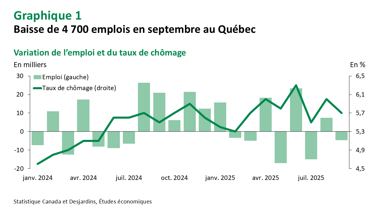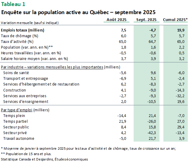 - Le taux de chômage a reculé, passant de 6,0 % en août à 5,7 % en septembre, le plus faible au pays. Cette baisse s’explique par le recul de la population active.