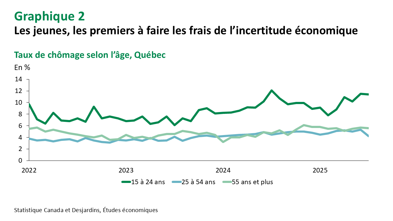 Dans ce même ordre d’idées, on constate que le marché du travail québécois demeure relativement vigoureux pour les travailleurs dans la force de l’âge (25 à 54 ans), avec un taux de chômage autour de 4 %. En revanche, la situation est nettement plus difficile pour les jeunes, dont le taux de chômage reste au‑dessus de 10 % depuis le début des turbulences économiques en cours (voir graphique 2).