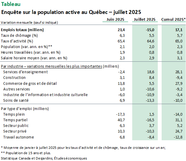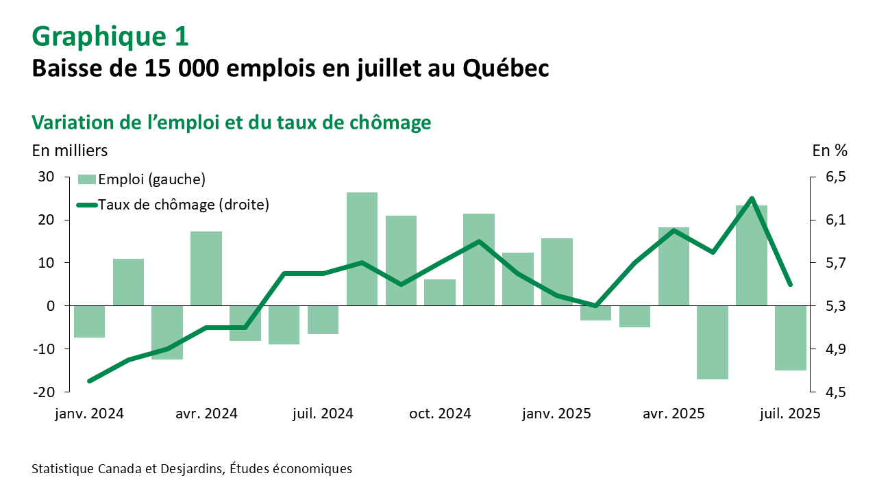 - En juillet, le marché de l’emploi au Québec a enregistré une perte nette de 15 000 postes, effaçant une partie des gains réalisés le mois précédent (+23 400).