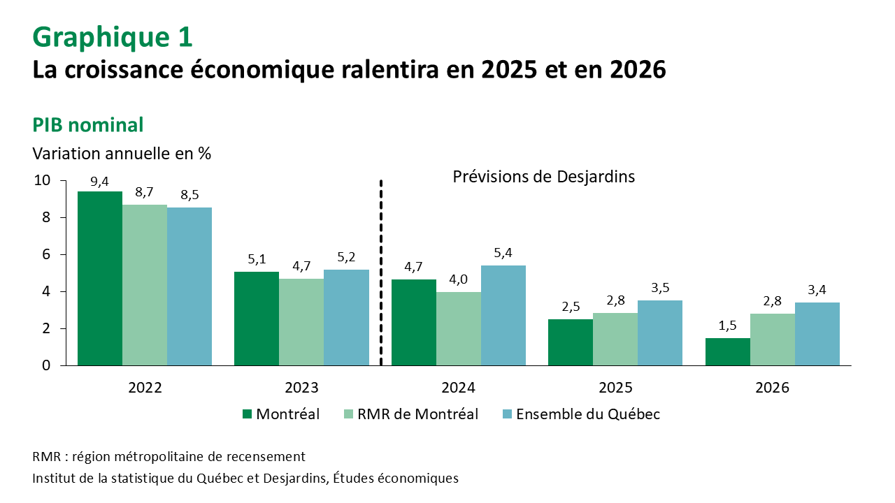 l’Accord Canada–États–Unis–Mexique (ACEUM). Néanmoins, les niveaux de confiance sont bas, ce qui nuit à la consommation et aux investissements partout dans la province. À Montréal, l’économie est bien diversifiée et devrait tenir le coup mieux qu’ailleurs.