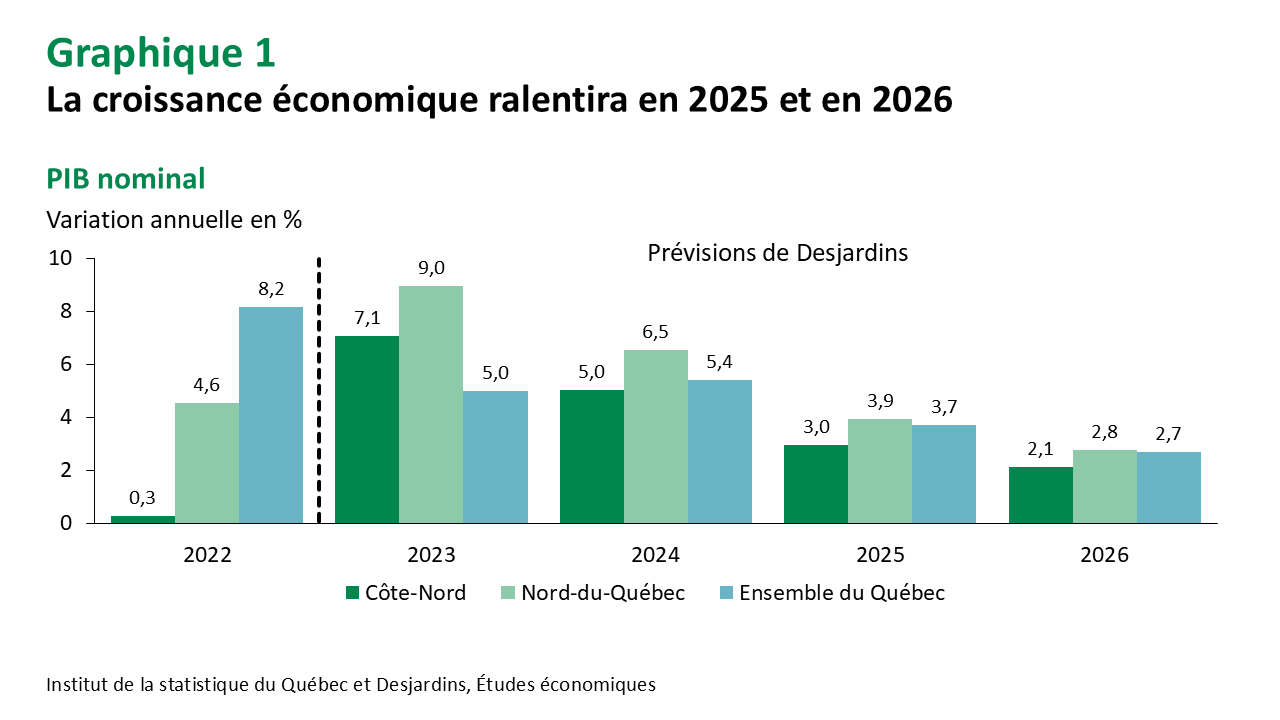 - L’incertitude entourant la guerre commerciale entre le Canada et les États‑Unis affecte l’économie du monde entier, et celles de la Côte‑Nord et du Nord‑du‑Québec n’y échappe pas. Les tarifs douaniers appliqués par l’administration américaine aux biens canadiens commencent à avoir des effets sur les échanges commerciaux et les investissements des entreprises des deux régions. Si le rythme de croissance du PIB nominal s’est avéré plus vigoureux que prévu en 2024 grâce à une forte augmentation des investissements, la hausse devrait se modérer lors des deux années suivantes (graphique 1).