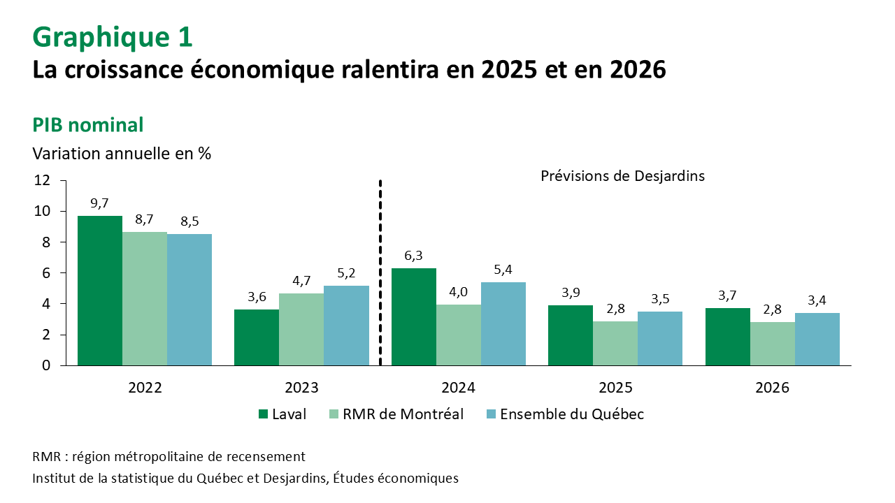 l’Accord Canada–États‑Unis–Mexique (ACEUM), les niveaux de confiance demeurent faibles. Cela freine les décisions de consommation et d’investissement sur le territoire. Laval se distingue des autres régions urbaines par une plus grande présence de son industrie manufacturière, un secteur particulièrement exposé à la guerre commerciale. Son économie reste toutefois plus diversifiée que les régions manufacturières. Dans ce contexte, la croissance du PIB nominal de la région pourrait être plus modérée au cours des deux prochaines années, tout en se situant au‑dessus de la moyenne provinciale (graphique 1). De plus, la baisse des taux d’intérêt amorcée l’an dernier contribue à atténuer l’incertitude sur le marché immobilier. La reprise de la construction résidentielle, particulièrement dans le segment locatif, soutient cette dynamique.