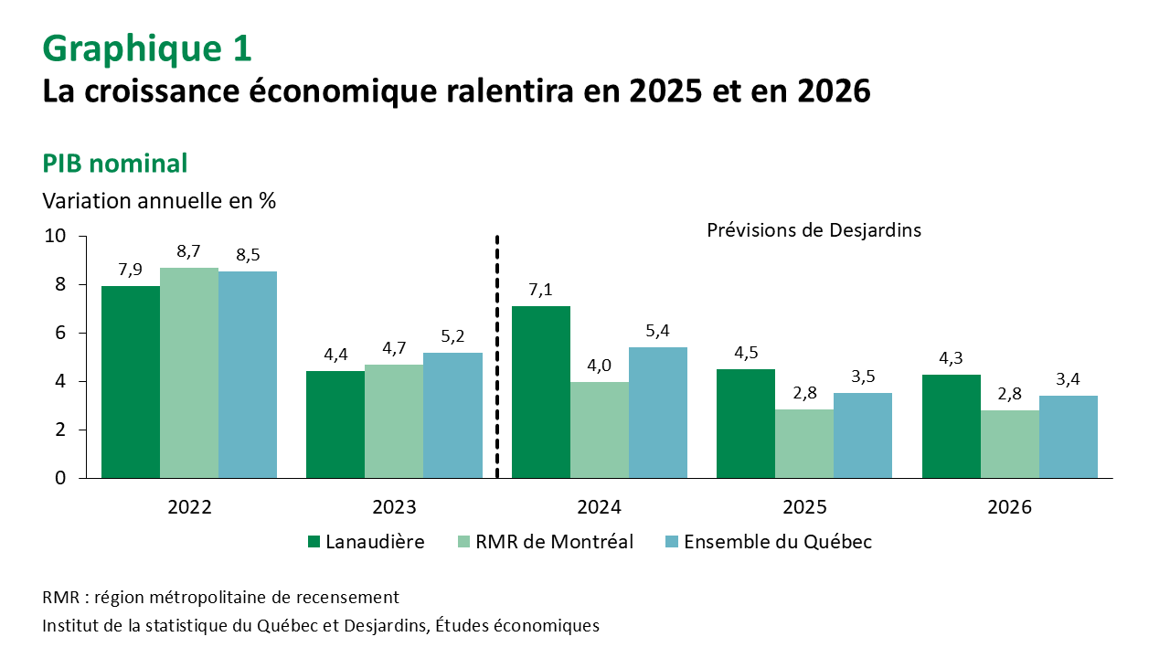 - Le rythme de croissance du PIB nominal régional devrait donc ralentir lors des deux prochaines années, tout en demeurant au-dessus de la moyenne provinciale (graphique 1). La force de la construction résidentielle et la croissance démographique avantagent aussi Lanaudière.