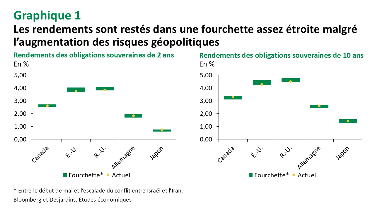 Cette escalade s’est traduite par des mouvements non remarquables sur les marchés des titres à revenu fixe, les rendements dans les diverses régions demeurant à l’intérieur des fourchettes récentes (graphique 1). De même, les marchés boursiers sont encore près de leurs sommets historiques et les prix du pétrole, malgré leur hausse, demeurent bien en deçà des récents pics. La réaction nonchalante des marchés reflète en partie l’absence perçue d’options de représailles de la part des dirigeants iraniens. Même si la circulation du pétrole en provenance du Moyen-Orient peut encore être perturbée, les marchés semblent croire que ce serait probablement temporaire, étant donné les vastes répercussions pour l’Europe et l’Asie. La hausse des prix du pétrole pourrait raviver certaines pressions inflationnistes à court terme, mais le risque d’une période prolongée de forte inflation demeure faible dans l’esprit des investisseurs mondiaux.