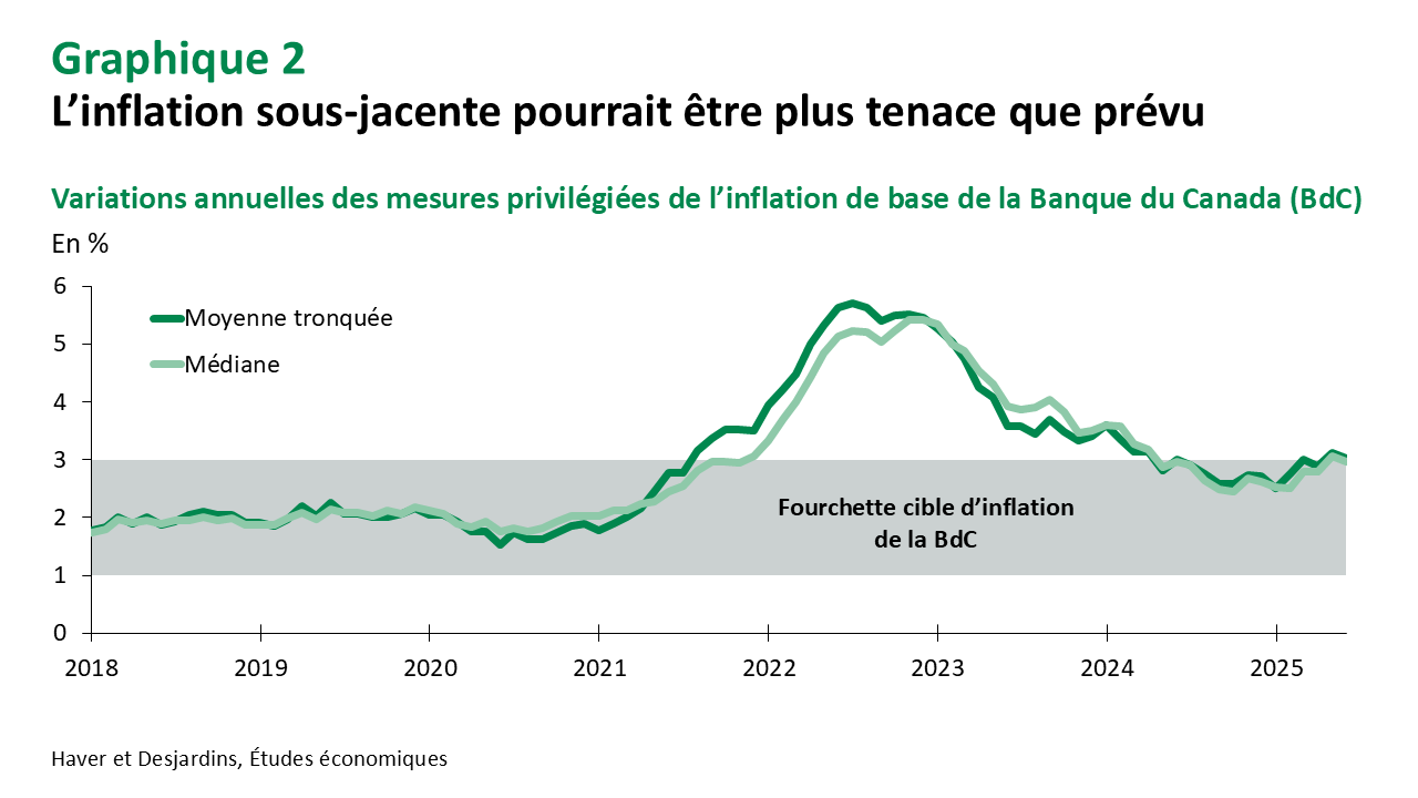 Après avoir réduit le taux des fonds à un jour de 225 points de base au cours de la dernière année, les banquiers centraux canadiens peuvent se permettre d’attendre. C’est d’autant plus vrai qu’un accord commercial pourrait être conclu bientôt. Les attentes en lien avec l’inflation ont été plus élevées que prévu au premier trimestre, et les indicateurs de l’inflation de base de la BdC tournent toujours autour de 3 % en glissement annuel (graphique 2). Les décideurs devront voir les progrès se manifester dans leurs mesures de l’inflation de base avant de recommencer leur cycle d’assouplissement. La bonne nouvelle, c’est qu’il y a eu des signes d’un tel refroidissement dans les résultats de mai de l’IPC. Les développements positifs sur le commerce et le potentiel d’une hausse des dépenses en infrastructure et en défense améliorent les perspectives économiques du Canada, mais il est encore possible d’offrir davantage d’assouplissement monétaire en raison des vents contraires liés à la faiblesse du marché de l’habitation, au ralentissement de la croissance démographique et au cycle de renouvellements hypothécaires en cours.