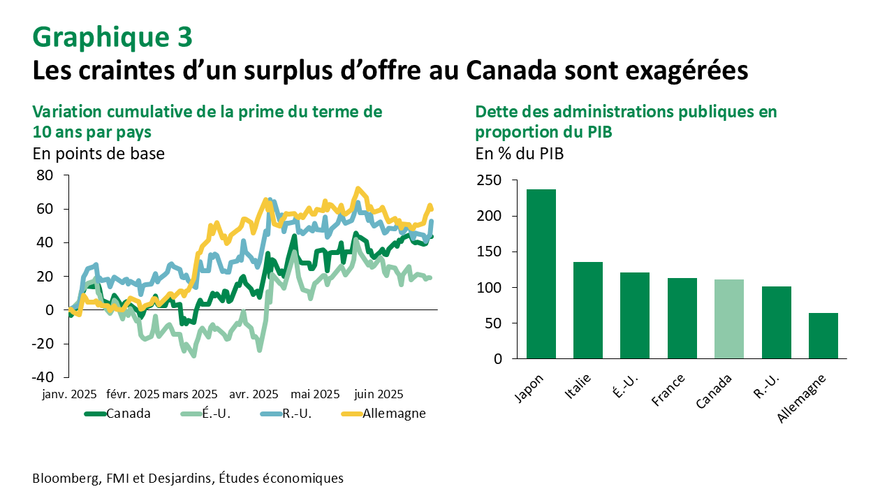 La possibilité d’une concentration en début de période des dépenses de défense et d’infrastructure a suscité des inquiétudes quant à la capacité du marché à absorber l’offre entrante (graphique 3, gauche). Nous pensons qu’elles sont exagérées. La situation financière du Canada est nettement meilleure que celle de bon nombre de ses pairs (graphique 3, droite). Malgré tout, les obligations à long terme canadiennes ont sous-performé par rapport à celles des États-Unis au cours du dernier mois. Cette situation pourrait perdurer en l’absence d’un budget fédéral.