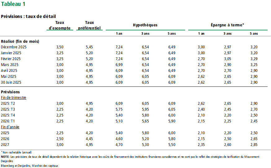 Nos prévisions concernant les taux des prêts hypothécaires et des dépôts à terme canadiens sont sensiblement les mêmes que lors de la dernière mise à jour.