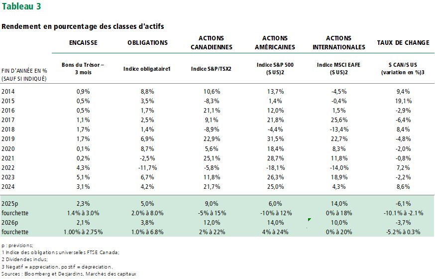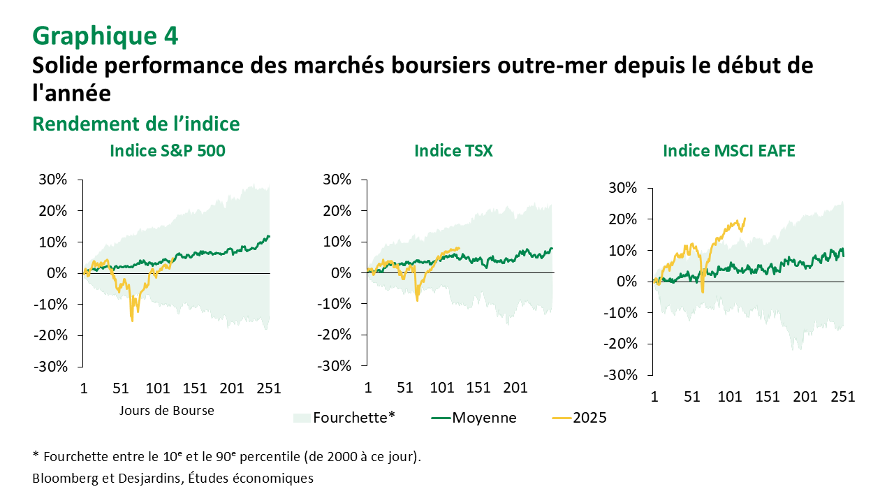 L’effet négatif des tarifs douaniers plus tôt cette année devrait commencer à peser sur l’activité économique et susciter des inquiétudes quant à un ralentissement plus marqué. L’incertitude géopolitique pourrait aussi peser sur le sentiment à court terme, bien que ses répercussions sur les bénéfices des sociétés nord-américaines soient moins claires. Nous nous attendons à ce que ces facteurs maintiennent les actions dans leur fourchette, mais les risques seront orientés à la hausse si l’économie américaine demeure vigoureuse et que les risques géopolitiques s’amenuisent.