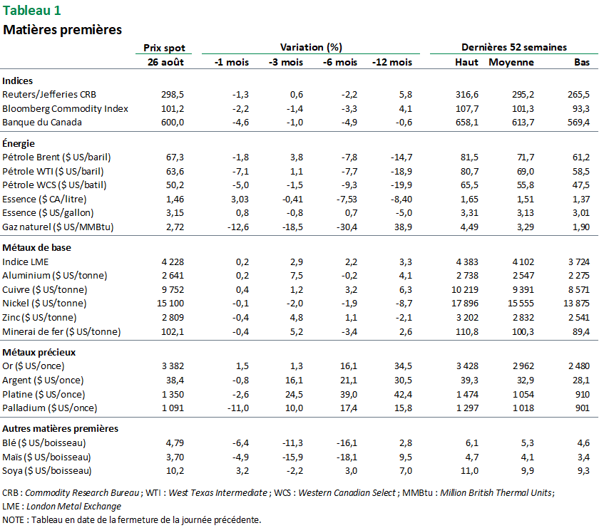 - L’offre abondante continue de peser sur les cours pétroliers, alors que le prix du WTI (West Texas Intermediate) s’est stabilisé autour de 64 $ US le baril après une période de volatilité accrue. La forte demande des raffineries, notamment en Asie, a temporairement soutenu les prix, mais cette dynamique pourrait s’inverser à mesure que l’Organisation des pays producteurs de pétrole et ses partenaires (OPEP+) augmentera sa production dans les prochains mois. Si les hausses planifiées du cartel se concrétisent dans leur entièreté, l’offre pourrait excéder la demande de près de 4 millions de barils par jour au premier trimestre de 2026, ce qui risquerait de provoquer une correction marquée des prix. Bien qu’il soit peu probable que l’OPEP+ produise autant, cela illustre clairement que les risques sont actuellement orientés à la baisse sur le marché du pétrole.