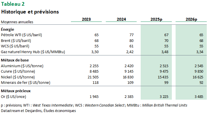 - La portée du tarif douanier américain de 50 % sur les importations de cuivre s’est révélée plus limitée que ce que le marché anticipait en juillet. En effet, les mesures ne visent qu’un nombre restreint de produits à base de cuivre, excluant le minerai brut et raffiné (pour plus d’information, consultez Le cuivre, la nouvelle cible de Donald Trump Lien externe au site.). Dans ce contexte, la prime nord-américaine sur le minerai, qui avait atteint plus de 2 300 $ US la tonne, s’est effondrée à la suite de l’annonce officielle. Elle demeure toutefois autour de 100 $ US, soit environ le double de sa moyenne historique, ce qui témoigne de l’incertitude persistante sur le marché. L’aluminium et l’acier ont également subi un nouveau revers avec l’ajout de plus de 400 produits à la liste des biens assujettis aux droits de douane de 50 %, comme les aérosols et les cadres de porte. Bien que seules les composantes métalliques de ces produits soient visées par les tarifs, cette mesure devrait exercer une pression à la baisse sur la demande. Malgré ces développements, nous maintenons nos cibles de prix de fin d’année pour les métaux industriels, puisque l’économie mondiale se montre plus résiliente face à la guerre commerciale qu’initialement anticipé.