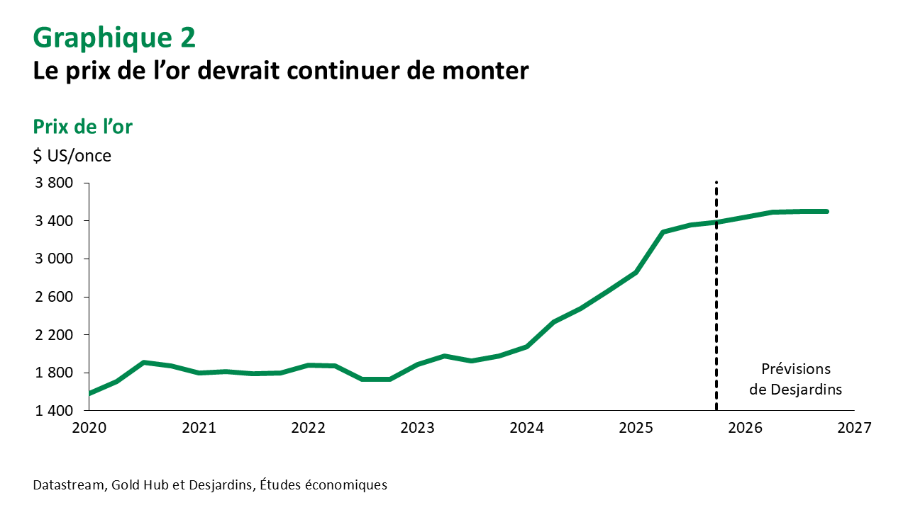 - Dans un contexte économique et géopolitique toujours marqué par l’incertitude, le prix de l’or devrait clôturer l’année aux alentours de 3 400 $ US l’once. La baisse anticipée des taux directeurs à l’automne et à l’hiver, combinée à une inflation qui demeure supérieure à la cible de 2 % aux États‑Unis, devrait maintenir le prix du métal jaune à 3 500 $ US l’once en 2026. Un autre facteur déterminant est l’augmentation des réserves d’or détenues par les banques centrales, un mouvement qui s’inscrit dans une dynamique de dédollarisation observée sur les marchés internationaux et qui ne montre pas de signes d’essoufflement.