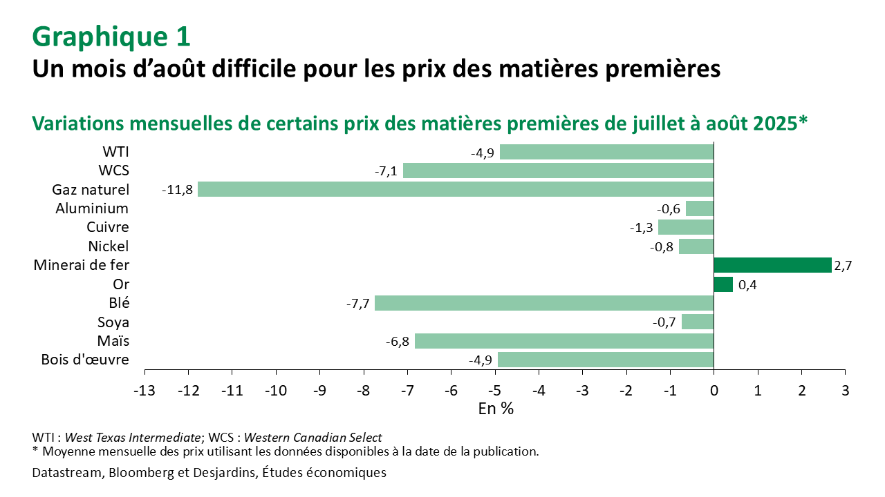 - Les prix du blé et du maïs poursuivent leur déclin. La météo favorable aux États‑Unis engendre de bons rendements et une production élevée pour le maïs, ce qui laisse présager une tendance baissière pour les prochains mois. Le blé aussi bénéficie d’une abondante production mondiale cette année. Les prix du soya ont rebondi durant la seconde moitié du mois d’août, et le plus récent rapport de l’USDA [en anglais seulement] Lien externe au site. indique que cela devrait se poursuivre, puisque les faibles superficies ensemencées annoncent une production moindre que l’an dernier pour la fève. Au Canada, les exportateurs d’oléagineux font face à une nouvelle embûche : après avoir imposé des droits de douane de 100 % en mars dernier sur l’huile et le tourteau de canola, la Chine applique depuis la mi-août un tarif de 75,8 % sur les graines de canola canadiennes exportées. Par ailleurs, les prix mondiaux des fertilisants poursuivent leur ascension : l’indice de la Banque mondiale [en anglais seulement] Lien externe au site. a bondi de 8 % entre juin et juillet, alimenté par les prix de l’urée.