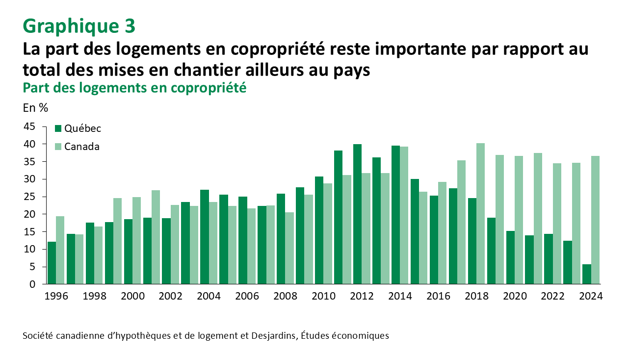 Il est difficile d’identifier la cause exacte de cette différence entre le Québec et le reste du Canada, mais plusieurs facteurs pointent vers les nombreuses mesures prises par le gouvernement provincial et les pouvoirs que celui-ci a octroyés aux municipalités. D’abord, le segment de marché le plus visé par une grande partie de cette aide gouvernementale est celui de la location et ce sont près de 80 % des unités construites au Québec qui y sont destinées (graphique 2). En Ontario, cette proportion se situe plutôt aux alentours de 40 %. D’ailleurs, la construction de logements locatifs permet présentement d’éviter certains défis auxquels font face les logements en copropriété. La prédominance de ces derniers en Ontario et en Colombie‑Britannique permet également de comprendre en partie la meilleure performance du Québec (graphique 3).