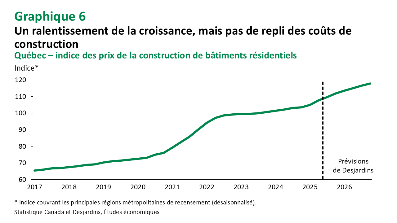 Les coûts de construction élevés Lien externe au site. pourraient aussi contribuer au ralentissement de l’activité. La hausse des salaires, soutenue par une forte demande de main-d’œuvre et par le renouvellement des conventions collectives, explique en partie la récente envolée observée au Québec (graphique 5). Malgré de légères baisses attendues des coûts des matériaux, les salaires et la concurrence pour les ressources nécessaires à la construction maintiendront les coûts élevés. Nous prévoyons une progression de l’indice des prix de la construction de bâtiments (IPCB) résidentiels d’environ 2 % d’ici la fin de 2025 et de 5 % en 2026 (graphique 6).