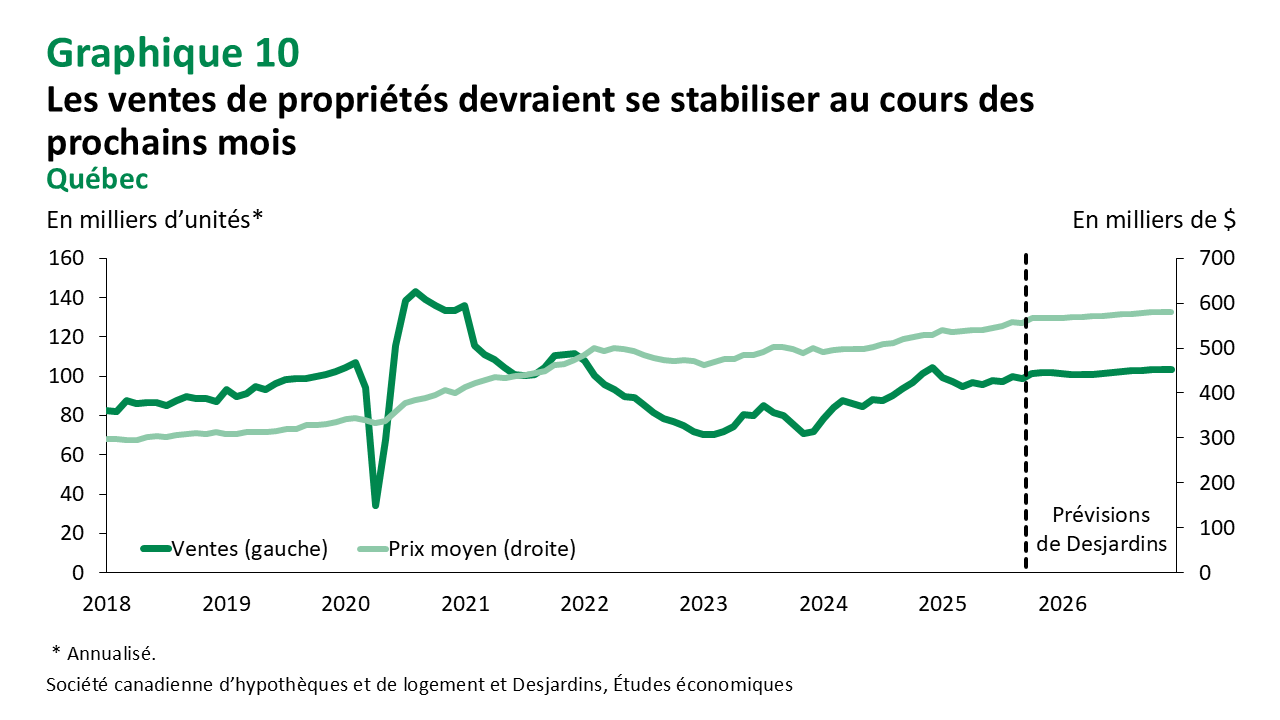 L’activité semble toutefois croître plus modérément depuis quelques mois, signe que l’incertitude pourrait finalement rattraper le marché de la revente. L’offre limitée et les problèmes d’abordabilité contribuent également à ce ralentissement de l’activité. Ce ralentissement de la demande devrait se poursuivre dans les prochains mois (graphique 10), d’autant que les baisses de taux hypothécaires sont désormais derrière nous, ce qui devrait cesser de stimuler la demande.