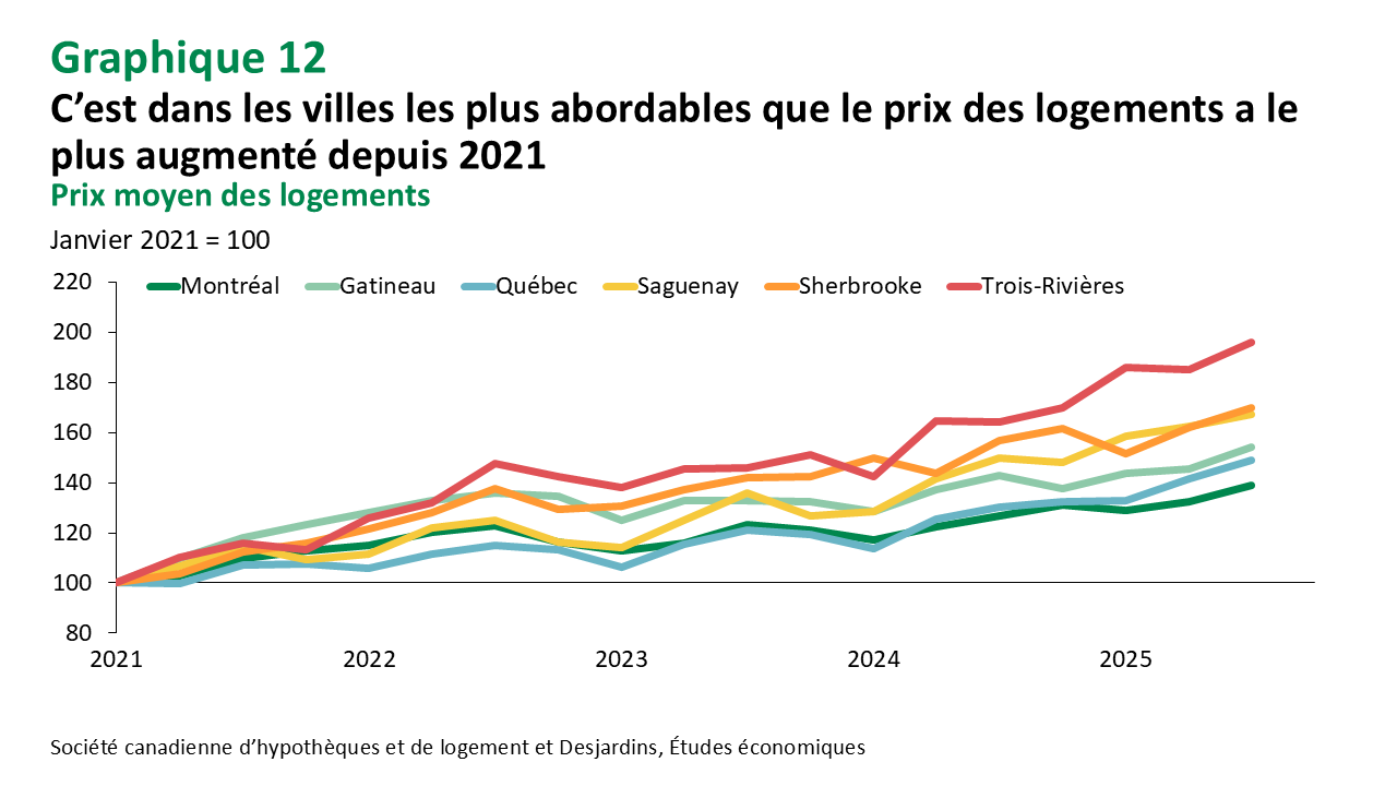 La hausse des prix a d’ailleurs été particulièrement marquée dans les villes les plus abordables de la province, portée par une demande soutenue (graphique 12). Entre le troisième trimestre de 2021 et celui de 2025, le prix moyen des propriétés dans la région métropolitaine de recensement (RMR) de Trois‑Rivières a bondi d’environ 70 %, contre 26 % dans la RMR de Montréal pour cette même période. Cette détérioration de l’abordabilité risque de freiner la demande au cours des prochaines années. Pour y remédier, la solution demeure donc de miser sur un accroissement de l’offre de logements, tout en tenant compte des segments qui répondent le mieux aux besoins du marché.