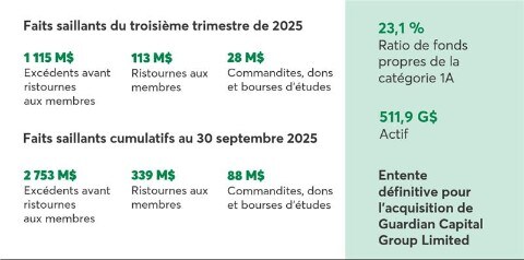 - Sujet : Communiqués de presse Desjardins présente ses résultats du 3e trimestre de 2025 et annonce une provision pour ristournes aux membres de 113 M$ 12 novembre 2025