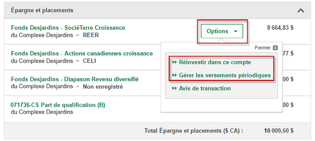 2a. Si vous possédez déjà ce produit : dans le sommaire, cliquez sur le bouton Options, puis Réinvestir dans ce compte ou Gérer les versements périodiques