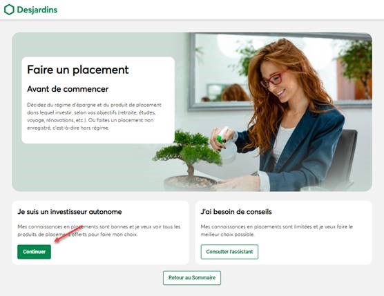 2b. Si vous ne possédez pas ce produit : dans le sommaire, cliquez sur Faire un placement (pour Portefeuilles Diapason et Portefeuilles SociéTerre seulement) et ensuite cliquez sur Continuer sous Je suis un investisseur autonome