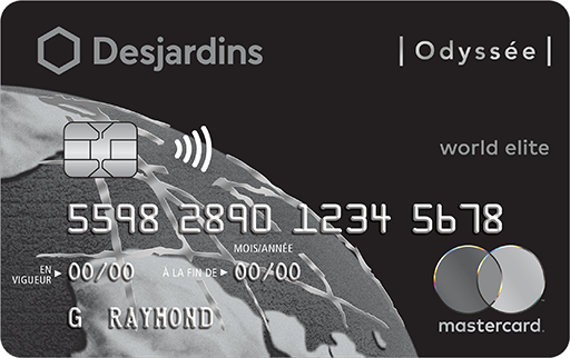 Odyssée MD est une marque déposée de la Fédération des caisses Desjardins du Québec. Mastercard MD et World EliteMD sont des marques déposées et le concept de cercles est une marque de commerce de Mastercard International incorporé  . * Marque de commerce de Visa International Service Association et utilisée sous licence. Ce rabais est applicable une fois par visite, par compte.Un accès est comptabilisé pour vous et chaque personne (sauf les enfants de moins de 3 ans) qui accède avec vous au Salon. L'accès doit avoir lieu dans les 3 heures précédant le vol, sinon un accès supplémentaire est déduit pour vous et chaque personne qui a utilisé vos accès.Certaines exceptions s'appliquent.